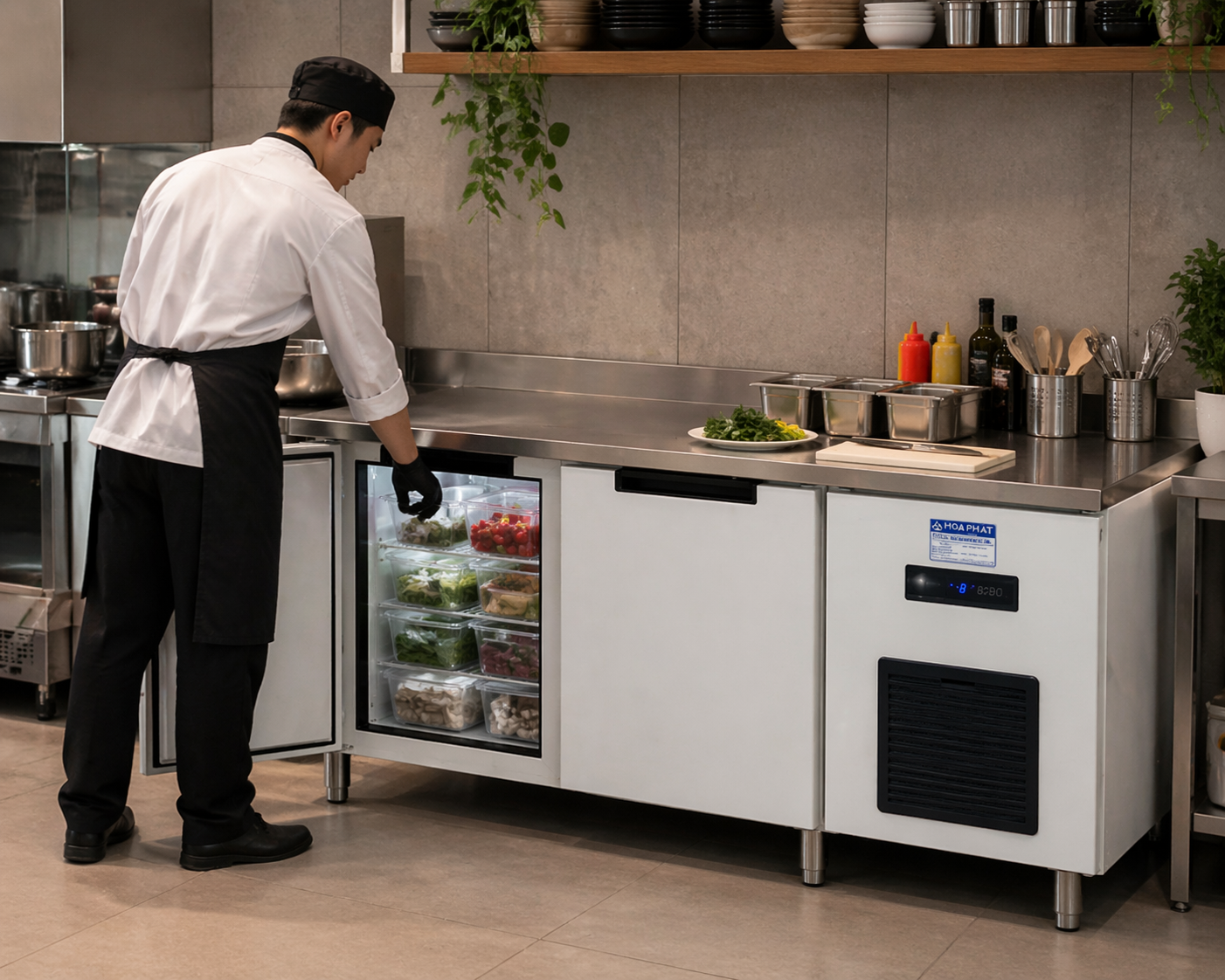 - Bàn đông mát trực tiếp chế độ có thiết kế nằm ngang gọn gàng, không cồng kềnh. Nó phù hợp với không gian bếp gia đình hoặc nhà hàng quy mô vừa, nhỏ.