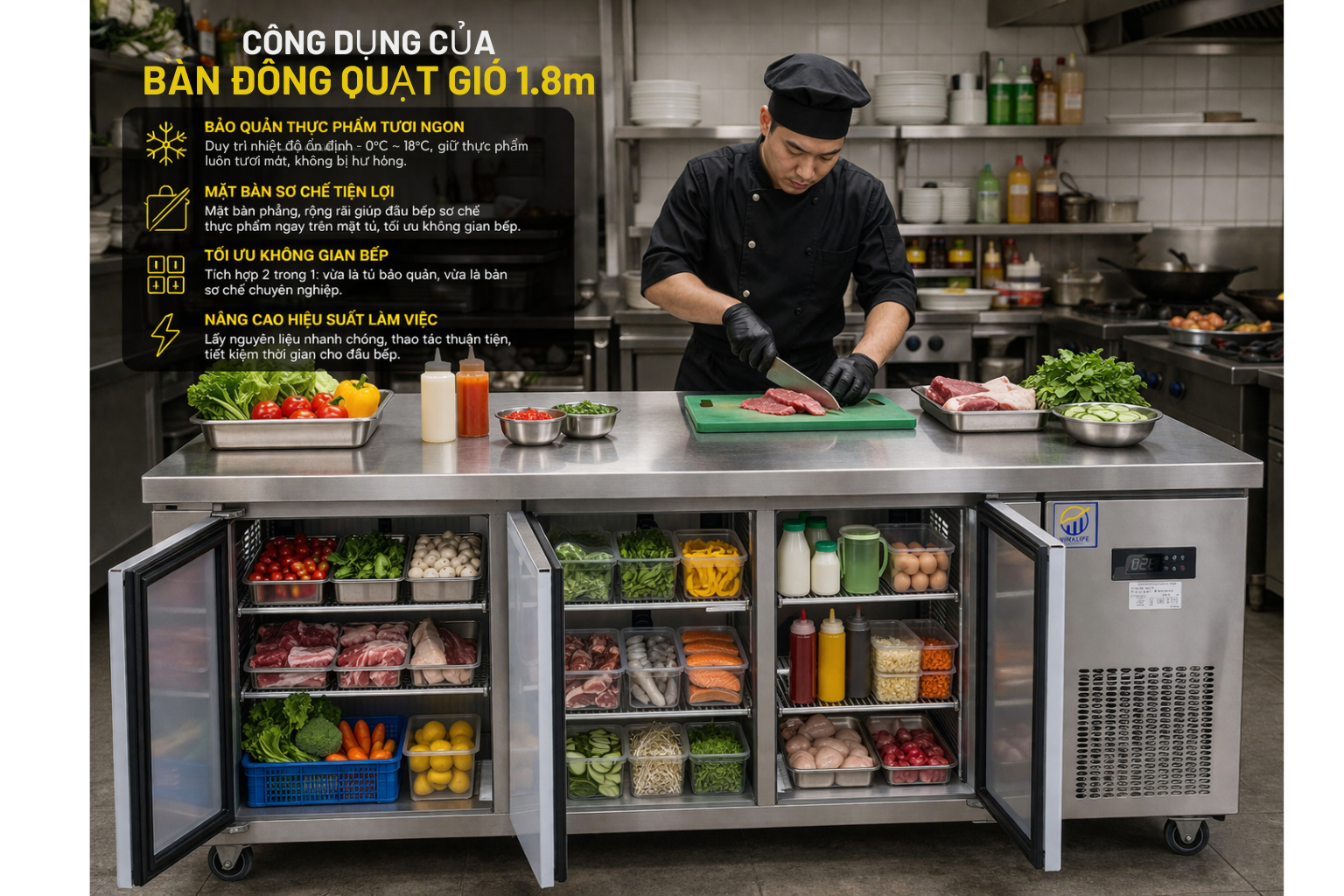 Công dụng nổi bật nhất của sản phẩm tủ bàn đông quạt gió cánh mở 1.8m đó chính là dùng để bảo quản đông cho thực phẩm. Sản phẩm này giúp thực phẩm luôn tươi ngon, được bảo quản trong thời gian lâu dài mà không làm mất đi những chất dinh dưỡng hay hương vị.