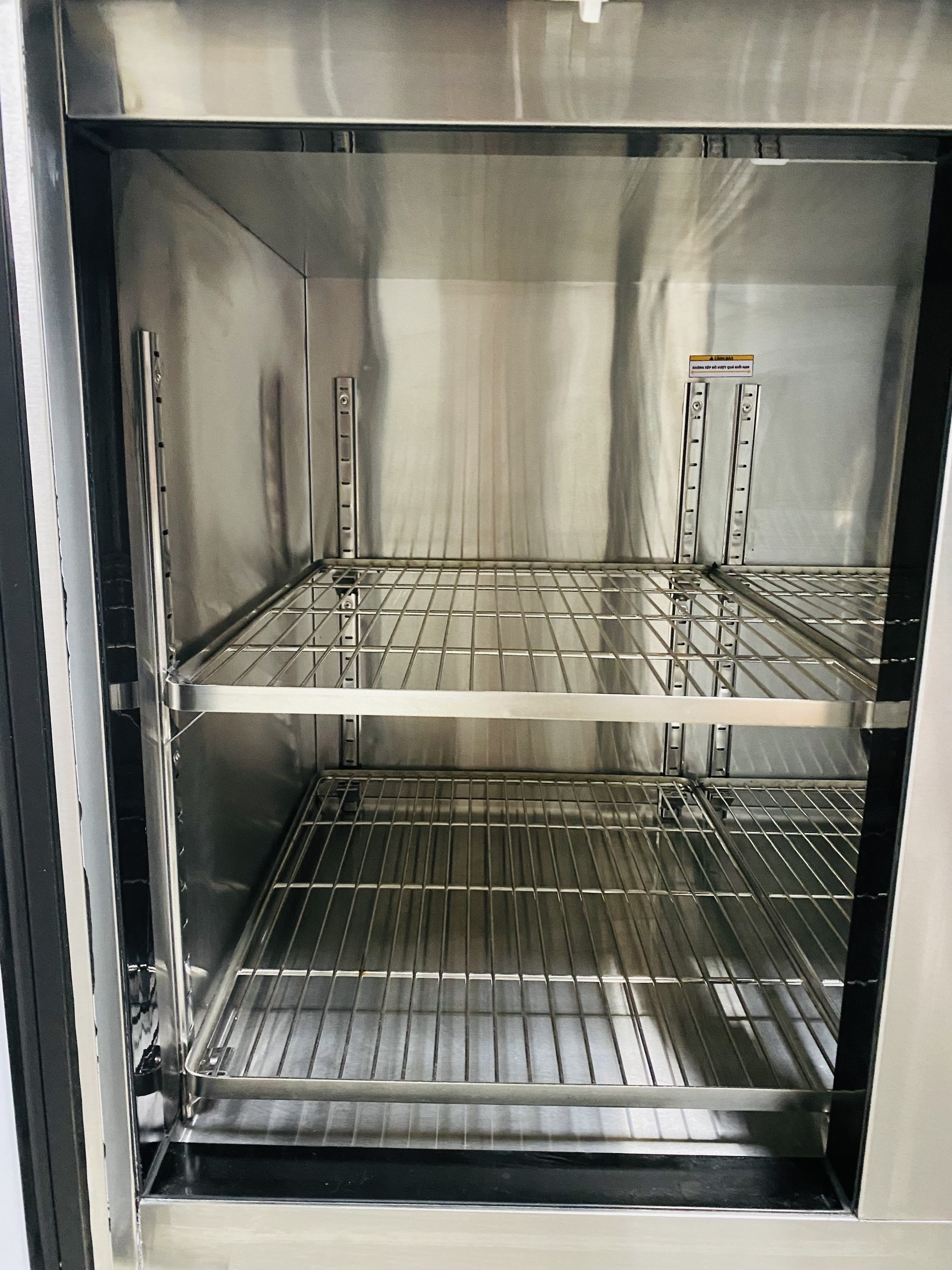 - Hệ thống tầng giá 100% inox chịu lực cho phép tùy chỉnh vị trí, hỗ trợ đắc lực cho quá trình phân loại, sắp xếp sản phẩm. Điều này cũng giúp người tiêu dùng thuận tiện tìm và lấy đồ ăn, thức uống từ tủ nhanh hơn.