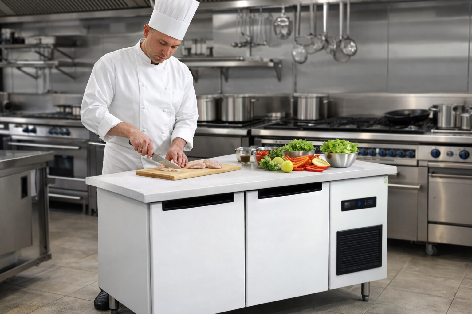 Tủ đông bàn chặt có công dụng bảo quản thực phẩm đồ uống được làm mát ở chế độ tiêu chuẩn là từ 2 đến 10 độ C. Ngoài ra tủ đông bàn chặt có thể giúp cho việc rã đông tiện lợi, an toàn mà giá trị dinh dưỡng của thực phẩm vẫn giữ nguyên.Bên cạnh đó tủ đông bàn chặt có mặt bàn được thiết kế cứng cáp, chắc chắn, có thể tiến hành sơ chế, pha chế ngay tại đây mà không lo ảnh hưởng gì đến chất lượng sản phẩm .