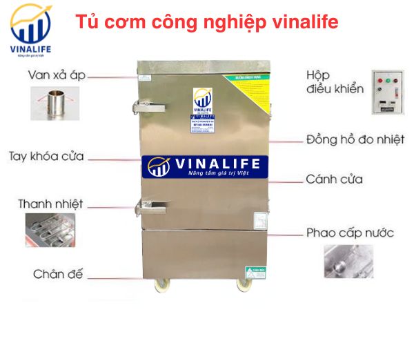 – Ngoài ra tủ nấu cơm dùng điện 8 khay Vinalife còn được thiết kế hệ thống van cấp nước, van xả đáy, phao cấp nước và hệ thống cấp điện an toàn, đồng hồ hiển thị nhiệt độ, các thanh gia nhiệt, giá đỡ khay và khay ,bánh xe.